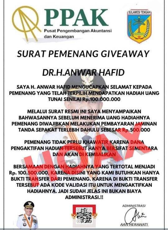 Pemerintah Provinsi Sulawesi Tengah melalui Biro Administrasi Pimpinan menegaskan bahwa berita ini merupakan *hoaks* dan Gubernur Anwar Hafid tidak pernah menyelenggarakan program giveaway berhadiah uang tunai.